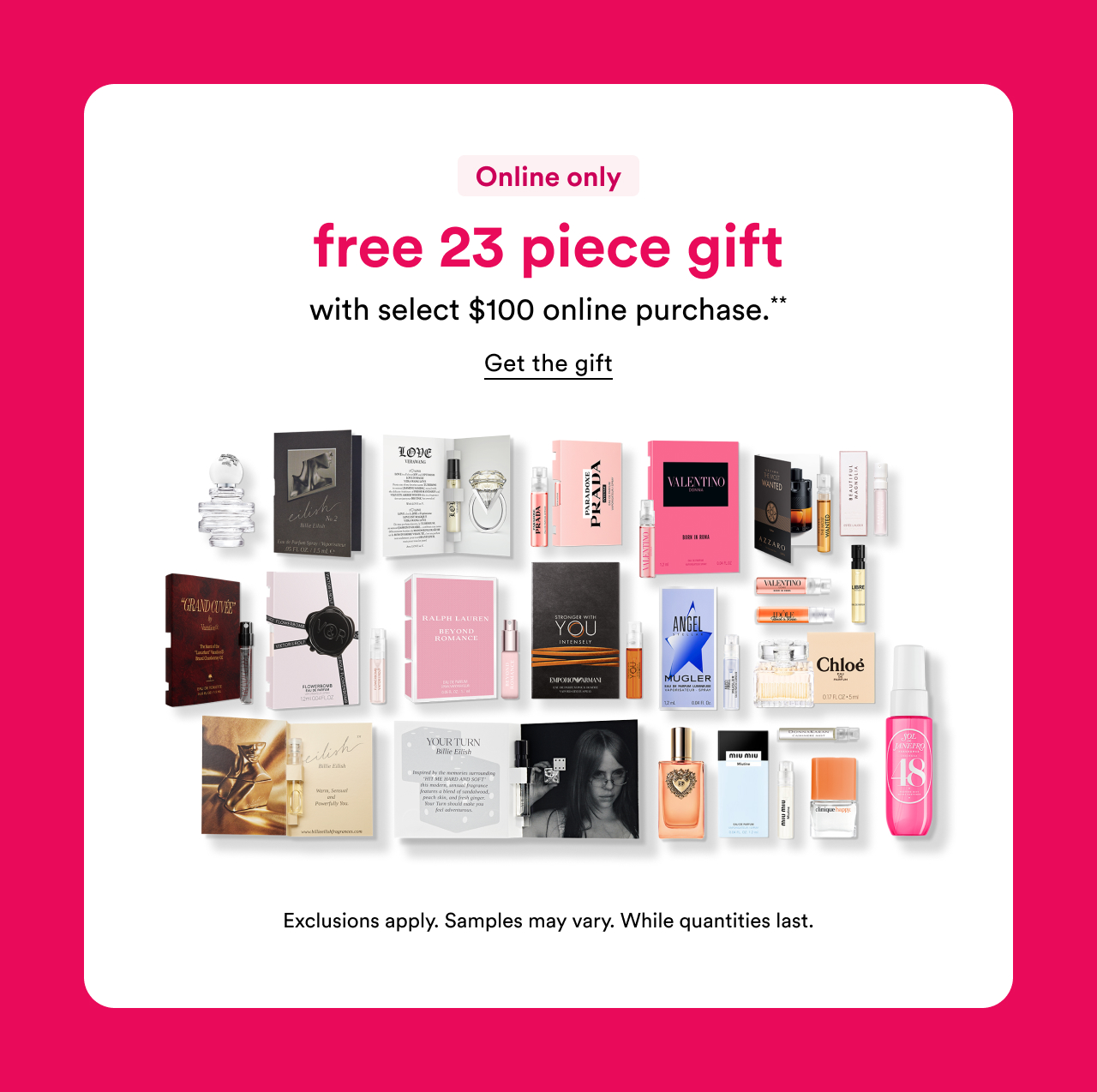 - Ulta -Get a Free 23 Piece Fragrance Gift with select $100 shipped purchase only. Choose a Free 16 Piece Beauty Bag with select $80 shipped purchase â 3 options.