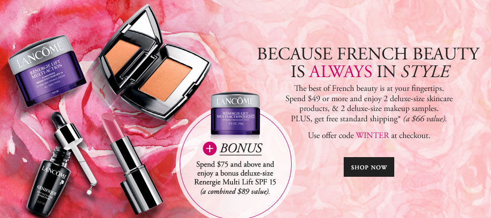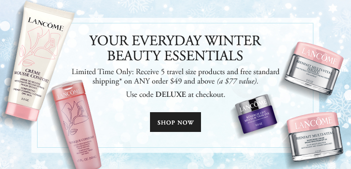 Lancome offers 3 exclusive gift with purchase any order over $49 and free shipping (February 2015)! First free gift is an assortment of skincare and make up (a $66 value) use code WINTER.