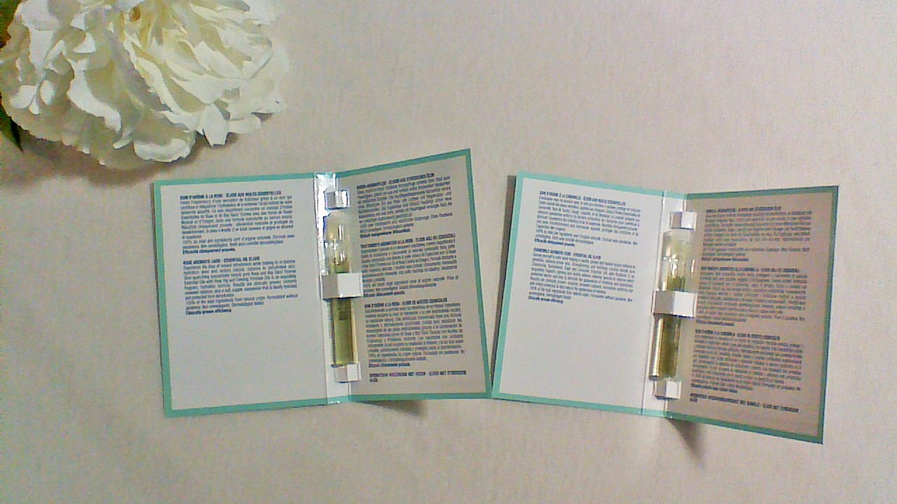 I think that I should get only 4 deluxe samples, but it’s 5. Lucky me. Below shows Chamomile Aromatic Care (1.4ml) and Rose Aromatic Care (1.4ml). I will give these two samples as a gift since I am not using oil in my routine.