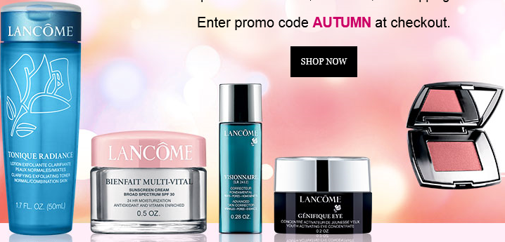 Lancome.com offers 4pc gift with any $49 order + free shipping with a Blush subtil step up gift with any $75 order (a combined $82 value). Use the code AUTUMN at checkout, ends 9/30. Choose 1 free deluxe sample at check out. Free shipping on orders over $49.