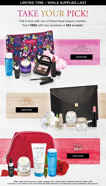 Lancome Canada (NEW) Get a FREE 6-pc Best Sellers Gift + Makeup Pouch with orders $65+ at Lancome Canada! Use code COLOUR at checkout (valid 5/30-6/3 or while quantities last). OR (NEW) Get a FREE 4-pc Absolue Gift + Makeup Clutch with orders $65+ at Lancome Canada! Use code WHITE OR (NEW) Get a FREE 4-pc Skincare Gift + Makeup Pouch with orders $65+ at Lancome Canada! Use code RED at checkout. Use code BONJOUR10 to get free shipping and 10% off your first order. Plus, Free 2 samples with any order.