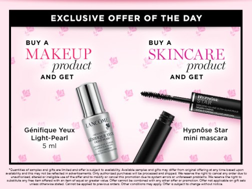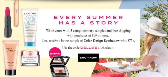 Lancome (NEW) Enjoy 5 Piece Sample and Free Shipping on Orders of $49 or more! Plus, receive a Bonus Sample on Orders of $75 or more. Enter code DELUXE at checkout. Valid 6/10 – 6/14/17.