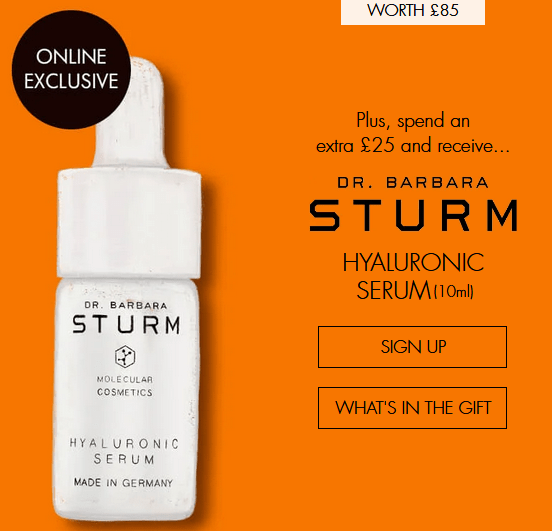GIFT 2: When you spend £200, Step-up gift! Plus, spend an extra £25 and receive Dr Barbara Sturm Hyaluronic Serum (10ml) worth £85.