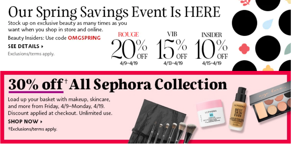 Rouge members, The Spring Savings Event is here! You have FIRST ACCESS to shop 20% off your favorite products! Unlimited use from 4/9 – 4/19, use code: OMGSPRING. Plus for the first time ever, Sephora Collection is 30% off during Spring Savings (discount applying in cart).