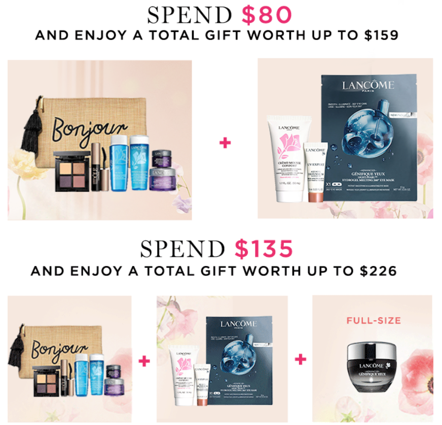 Lancome (NEW) Free engrave on select items. (1d) Choose Your 7-piece Gift on Orders $45+ Plus An Additional 3 Pieces on Orders $80+ Plus a Full Size Product on Orders $135, ends 4/16. Up to 70% off sale. Lancome gift with purchase offers and coupons. Choose free sample at checkout + free shipping on $75 purchase.