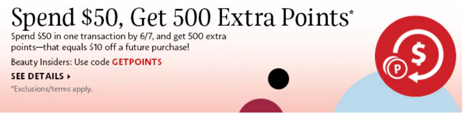 Sephora and Sephora.ca (NEW) Spend $50, get 500 extra points. Use code GETPOINTS, ends 6/7 (stacks with free gift coupon).