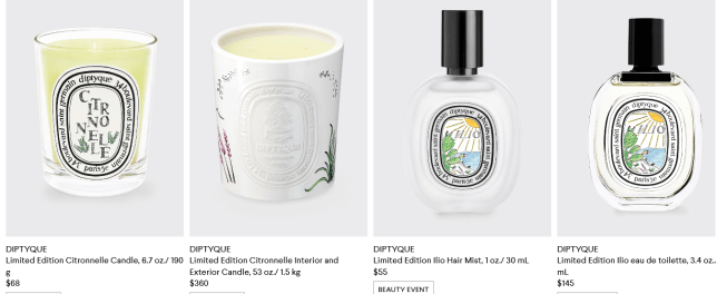 Diptyque UK and Diptyque USA (NEW) Receive a mini Citronnelle candle on orders of $100 or more with code SUMMER21. (NEW) Diptyque The summer collection has arrived… on the shores of the Mediterranean, in a limited edition. Ilio has arrived near the Barbary figs. Vinaigre de toilette has joined the party, with a sprig of lavender. And before nightfall, the body spray and Citronnelle have arrived, to chase off the mosquitoes and delight the evening.