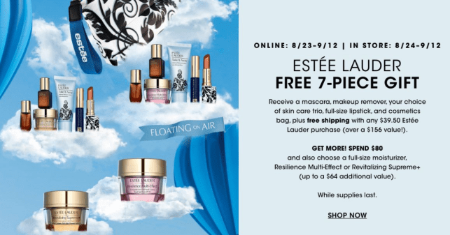 Bloomingdales (NEW) Receive your choice of a 7-piece gift with any Estee Lauder purchase of $39.50 or more (a $156 value). Free shipping with any $39.50 Estee Lauder purchase.