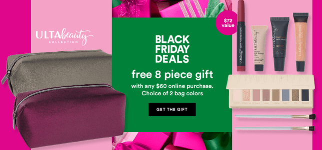 - Ulta Black Friday Free gift! Free 8 Piece Gift with $60 purchase ($72 value) – choose from 2 options.