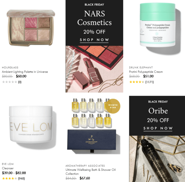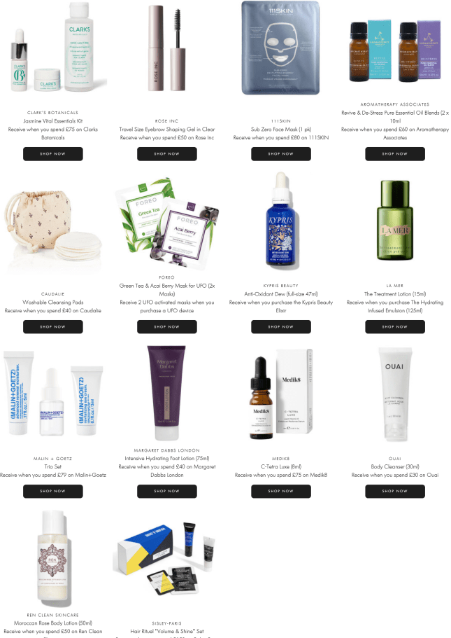 111Skin |Alpha-H | Anastasia Beverly Hills | Aurelia Probiotic| Becca | Benefit | BLEACH London | Briogeo | By Terry | Charlotte Tilbury |Dr Barbara Sturm | Dr Dennis Gross | Disciple | Drunk Elephant | Emma Hardie | FARMACY | Fresh | Glow Recipe | Herbivore | HOURGLASS | Huda | Iconic London | Indeed Labs | IT Cosmetics| Jordan Samuel Skin| Emma Hardie | La Mer | Laura Mercier | Lime Crime | Milk Makeup | MGC Derma | Morphe | NARS | Natasha Denona| Nurse Jamie | NYX | NYX and Farmacy | Olaplex | Omorovicza | Pixi x Caroline Hirons | Pixi | ROEN | Shiseido | SkinOwl | Su-Man| Sunday Riley | Surratt Beauty | SUQQU | THE INKEY LIST | The Ordinary | Theragun | TONYMOLY | Tata Harper | Uma | VENeffect | Victoria Beckham Beauty | Violet Voss | Viseart | Westman Atelier | Zelens | Zoeva