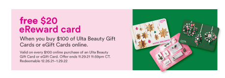 - Get a free $20 eReward Card when you buy $100 Ulta gift cards or eGift cards online.