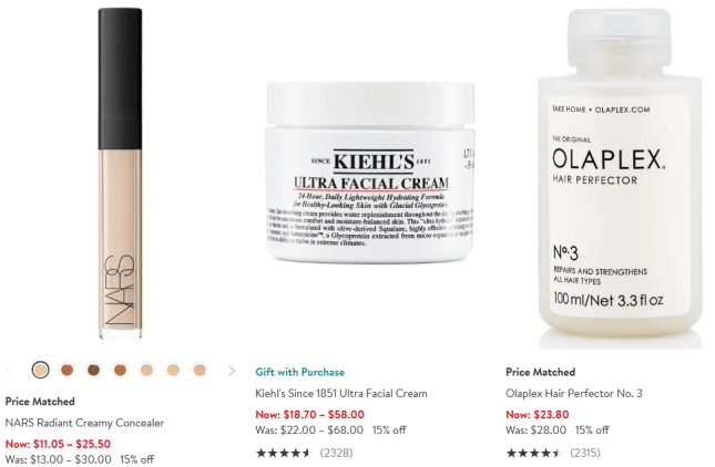 15% off Bobbi Brown | 15% off Kate Somerville | 15% off Kiehl’s | 15% off Laura Mercier | 15% off select Olaplex
