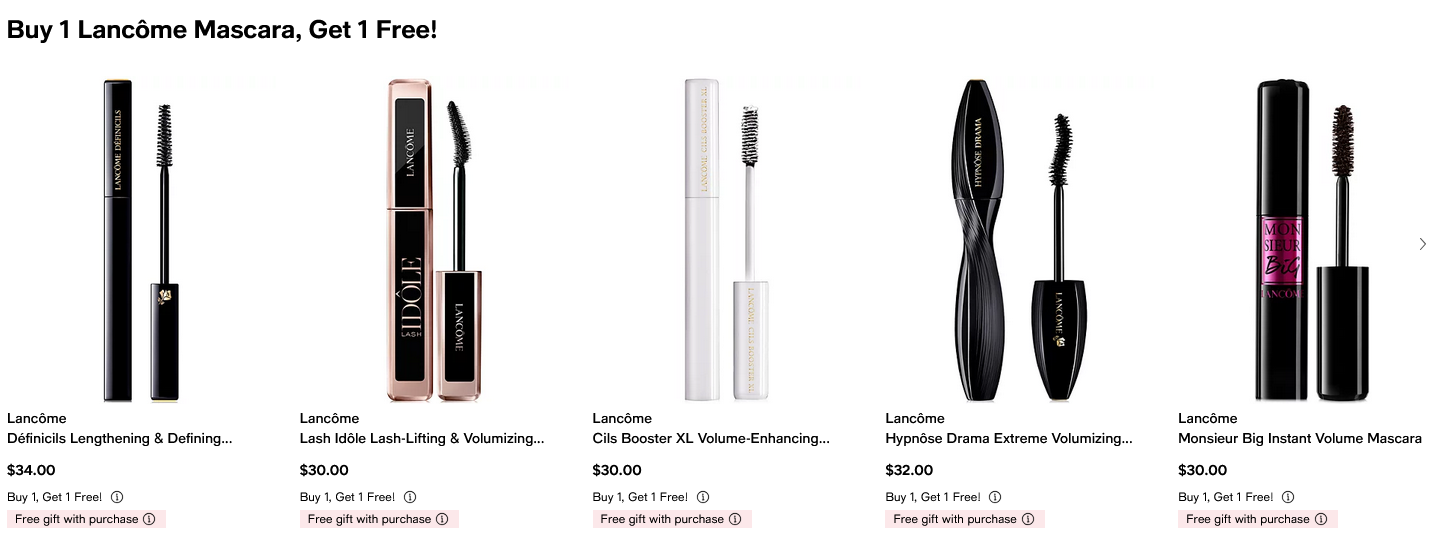 - Macy’s -Get up to 40% off eye makeup deals (3 pages) and BOGO free all Lancome Mascaras -– 150+ deals. FREE 7-Pc. gift with any $39.50 Lancôme purchase (up to $188 value!). Spend $80, Get More! Choose your 2-Pc. gift with any $80 Lancome purchase (up to $239 value!). Explore all Macy’s beauty gift with purchase.