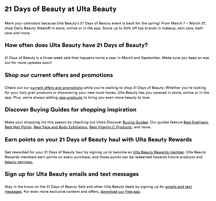 21 days, of course! Our event runs March 7-27, 2025. Mark your calendar and be sure to sign up for Ulta Beauty emails so you know when our next big events are coming up.