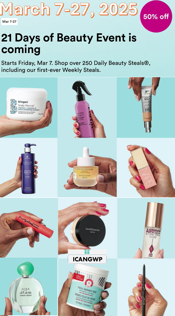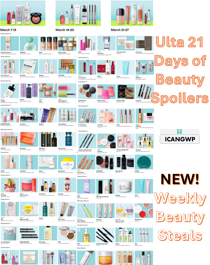 FYI – Ulta 21 Days of Beauty Events were extended in the past few years. We may be able to get all previous steals on March 28 only. Get 50% off all previous daily beauty steals and more at Ulta.com/21days or ulta.com/22days.
