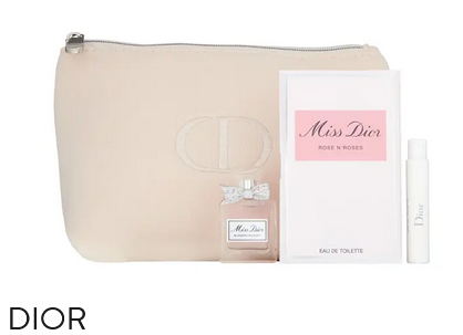 Receive a cosmetics bag and deluxe samples of Miss Dior Blooming Bouquet Eau de Toilette (0.2 oz.) and Miss Dior Rose N’Roses Eau de Toilette (0.03 oz.) with your $165 DIOR women’s fragrance purchase.