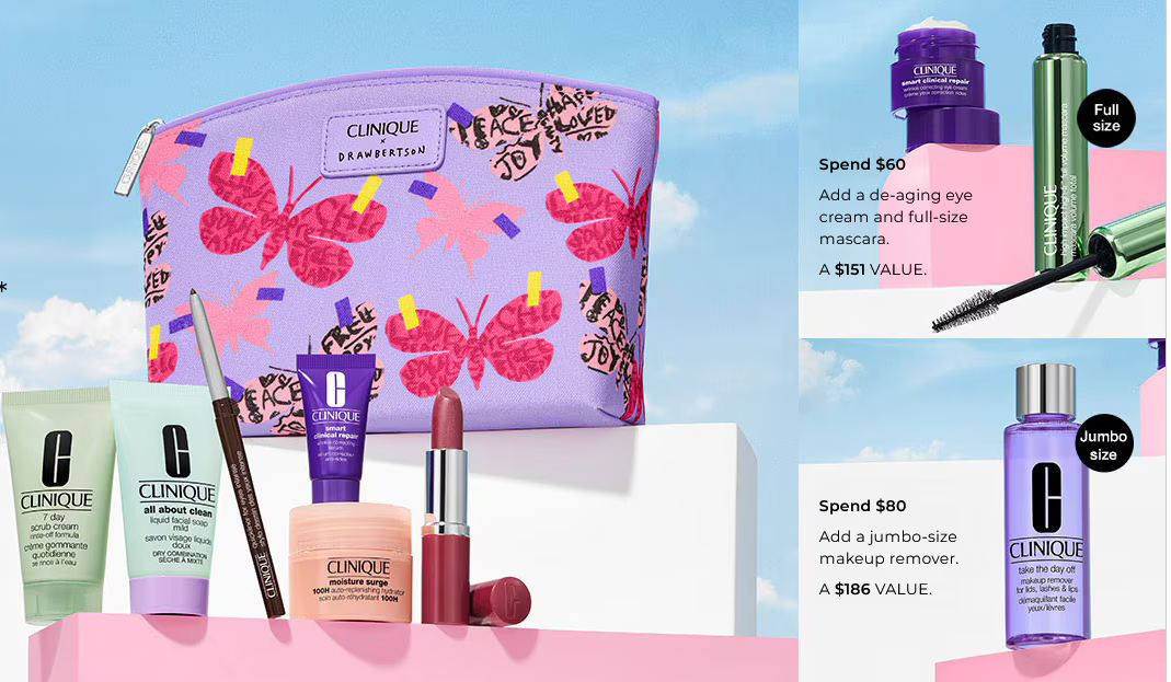 Spend $80 or more and get a free jumbo-size Clinique Take the Day Off Makeup Remover – A $186 Value.