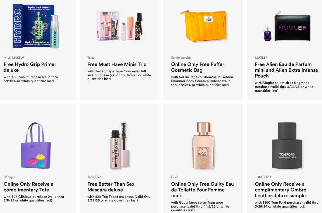 See Sephora coupons. There are new items in the SEPHORA Rewards Bazaar, you can use Sephora points to redeem for free. Pick two free samples with any purchase (no minimum) here. See Sale page here. See all available kits at Sephora Favorites, Sephora Favorites Canada or Sephora Favorites at Kohl’s.