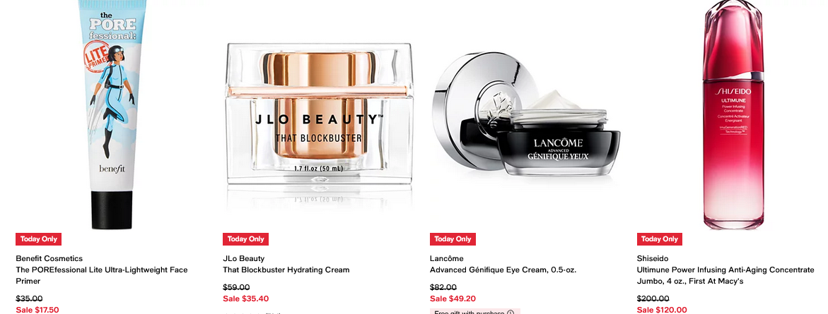 - Macy’s Beauty Flash Sale Event – up to 50% off over 1.3K items including YSL, Estee Lauder, Lancome and more. Past Macy’s Beauty Boxes are available for $15. FREE 6-Pc. gift with any $45 Estee Lauder purchase (Up to a $162 Value!) + two step-up gifts. Explore all 133 Macy’s beauty gift with purchase.