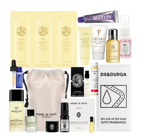 Includes: Oribe Hair Alchemy Trio: Resilience Shampoo, Resilience Conditioner (2 x 7 ml), Treatment Serum (5 ml), Oribe Hair Alchemy Heatless Styling Balm (15 ml), Marvis Jasmin Mint Toothpaste (10 ml), Rahua Omega 9 Hair Mask (22 ml), Molton Brown Flora Luminare Bath & Shower Gel (30 ml), R+Co Candy Stripe Protect + Prep Detangling Spray (30 ml), Odacite Vitamin C & E + Hyaluronic Acid Brightening Serum (4 ml), Odacite C-Glow Hydra-Firm Body Oil (30 ml), Olverum Bath Oil (5 ml), Sangre de Fruta Skincare Trio Set: Garden of Earthly Delights Botanical Tonic (5 ml), Morning Light Botanical Face Cream (1 ml), Solis Flower Nectar Botanical Face Serum (1 ml), Diptyque Do Son Eau de Parfum (2 ml), Dr. Hauschka Moor Lavender Calming Body Oil (10 ml) and D.S. & Durga Big Sur After Rain Auto Fragrance (1 pc).