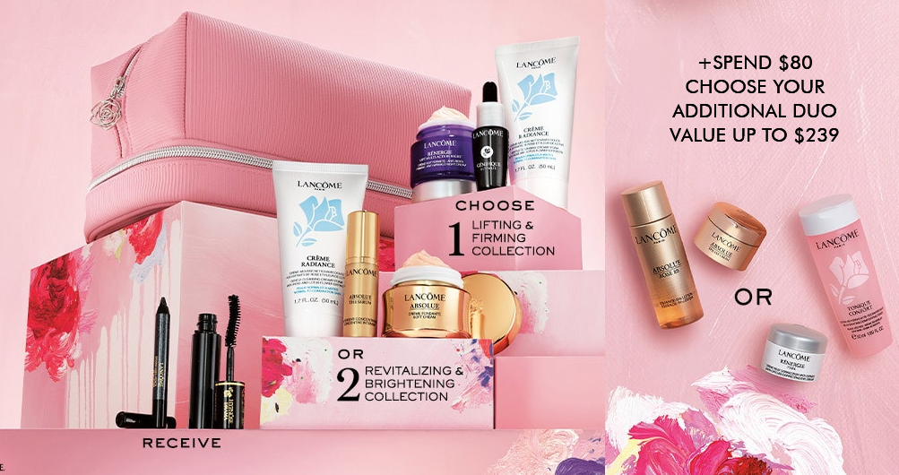 Get More! Spend $80 on Lancome and receive a facial duo. Total Gift Valued Up To $239*!