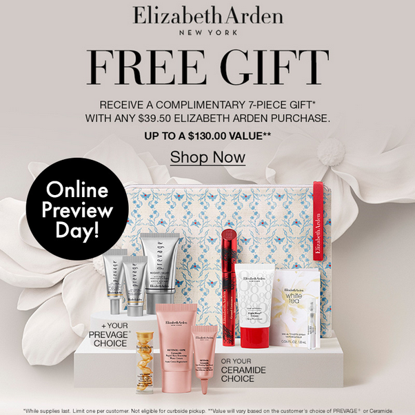 Boscov’s (NEW) Free floral tote and pouch with any $65 beauty purchase. Receive a complimentary 7-piece gift with any $39.50 Elizabeth Arden purchase.