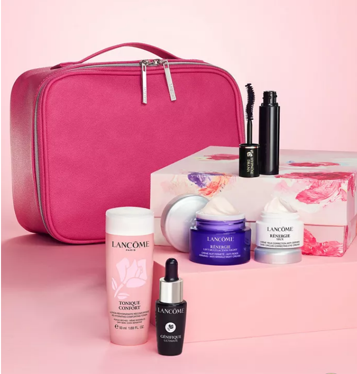 Rénergie Lift Multi-Action Night Cream, Rénergie Eye Cream, Génifique Ultimate Recovery Serum, Tonique Confort Hyaluronic Acid Toner, Hypnôse Drama Mascara, Cosmetics Bag