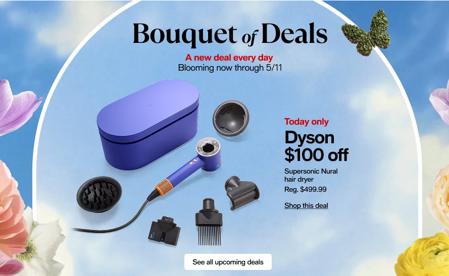 Macy’s Bouquet of Deals through May 11, while supplies last. Today only: Dyson Supersonic Nural Hair Dryer $100 off now $399.99 (20% off). See all upcoming deals.