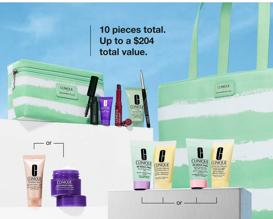 Clinique (NEW) Get a free 8pc gift with $50 purchase, and spend more to get a free 10pc gift, up to $204 value.