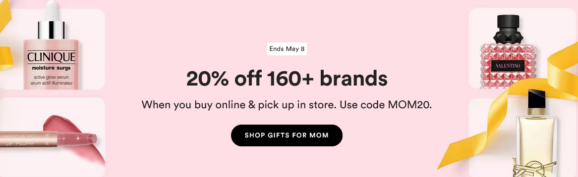 Ulta – Use code MOM20 to get 20% off 160 brands (6K items) when you buy online & pick up in store, ends 5/8.