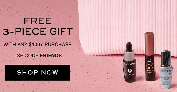 Get 25% off or Members get 30% off + free 3-piece gift with $100 purchase code FRIENDS. Gift includes: Lash Idole Mascara Mini Advanced Genifique Light Pearl Eye Serum, 5ml Genifique Ultimate Recover Serum, 7ml.