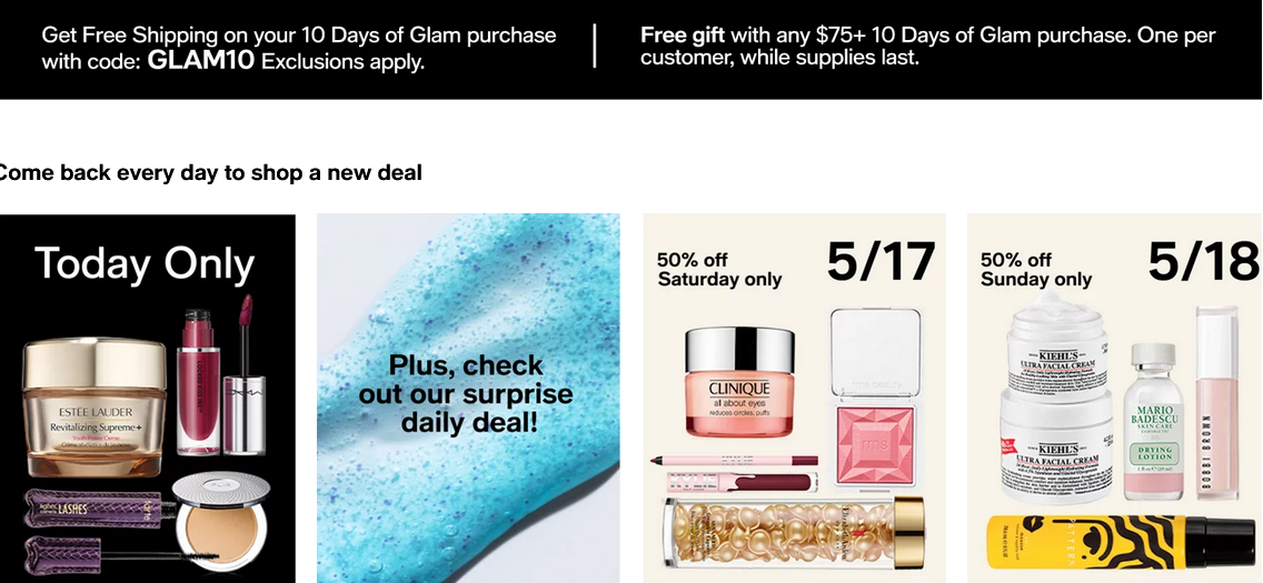 Macy’s (NEW) Get 50% off beauty daily deals during Macy’s 10 Days of Glam May 16-25, 2025 + free shipping use coupon code GLAM10 – see all deals here (12 pages).