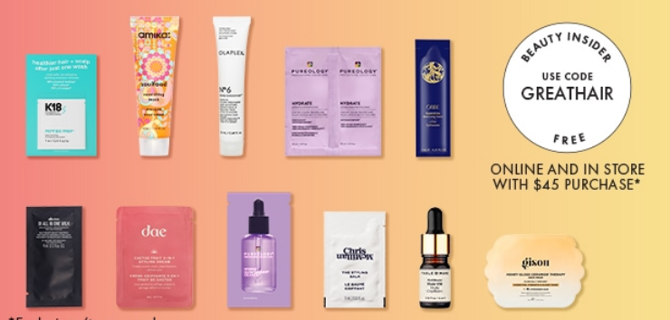 Sephora Get a free 10pc sample bag with $45 purchase code GREATHAIR. Bonus Day: Sephora Daily Deals Event for 21 Days is here – 20 items.