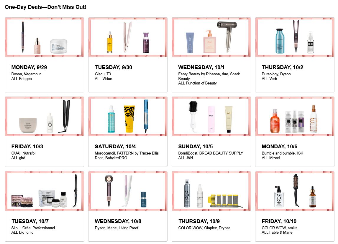 Sephora (NEW) HAIR DEALS UP TO 50% Off– NEW DEALS DAILY. New savings every day through 10/10. New arrivals. See Sephora coupons. There are new items in the SEPHORA Rewards Bazaar, you can use Sephora points to redeem for free. Pick two free samples with any purchase (no minimum) here.