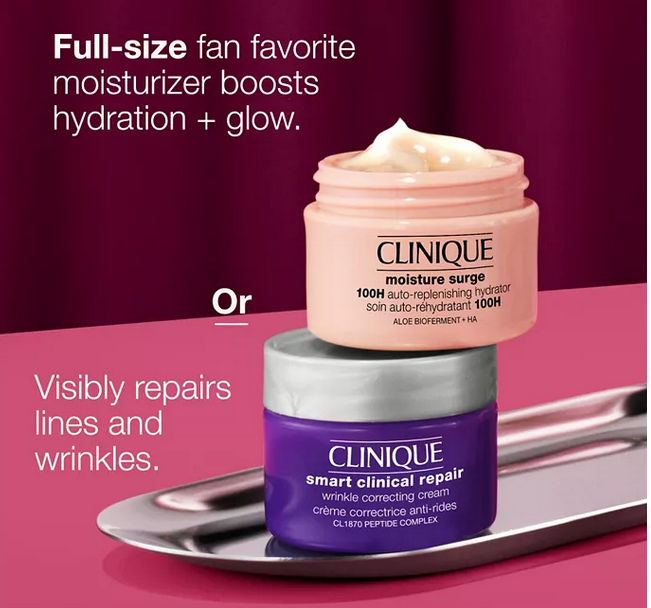 Choose a FREE Full-Size Hydrating Moisturizer or De-aging Face cream with any $60 Clinique purchase (Up to a $169 Value). Choices Include: