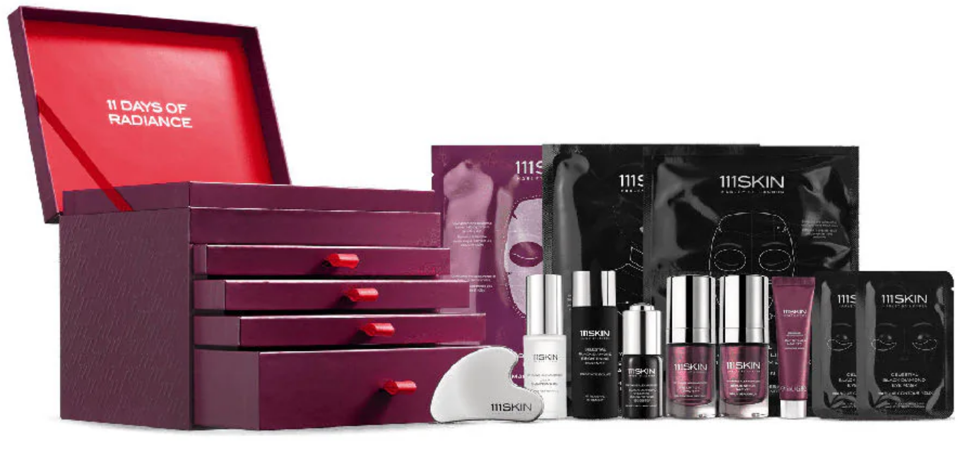 - 111SKIN 11 Days of Radiance Advent Calendar 2025 is priced at $815. Set includes full sizes of Eye Lift Gel NAC Y2 and Black Diamond Vitamin-C Brightening Booster, alongisde 9 other best-selling products in travel size.