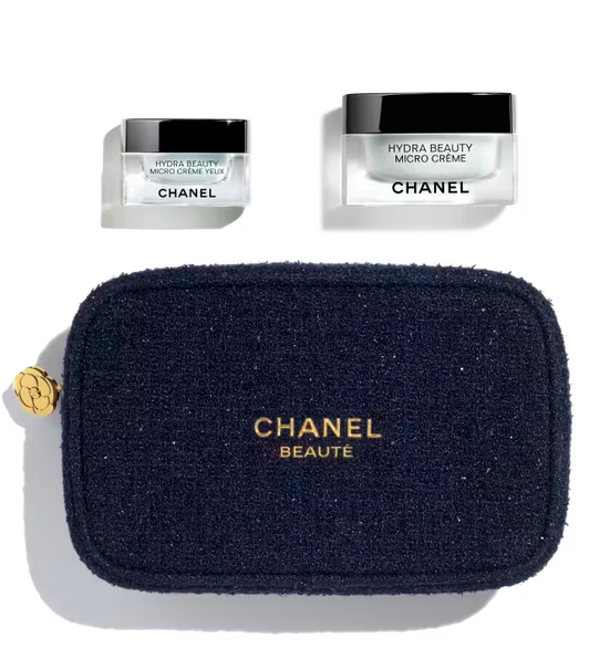 Enter the wonderful world of CHANEL and discover the perfect holiday skincare set. HYDRA BEAUTY MICRO CRÈME YEUX and HYDRA BEAUTY MICRO CRÈME are presented in a limited-edition pouch inspired by the stars: Woven from shiny black and midnight blue threads and elevated by golden detailing, it includes a zipper pull in the shape of a camellia, a House symbol.