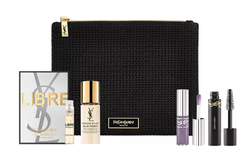 Receive a cosmetics pouch and deluxe samples of Libre Eau de Parfum (0.04 oz.), Touche Éclat Blur Face Primer (0.34 oz.), Loveshine Plumping Lip Oil Gloss in Thunder Stealer (0.04 oz.) and Lash Clash Extreme Volume Mascara in Black (0.06 oz.) with your $175 YSL beauty or fragrance purchase.