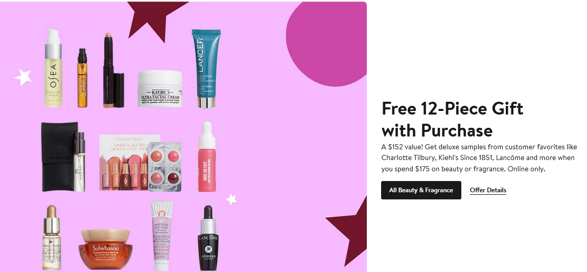 - NORDSTROM fans, they are giving away Free 12-Piece Gift with Purchase! A $152 value! Get deluxe samples from customer favorites like Charlotte Tilbury, Kiehl’s Since 1851, Lancôme and more when you spend $175 on beauty or fragrance. Explore 70+ Nordstrom beauty gift with purchase. All 700+ Beauty Sale.