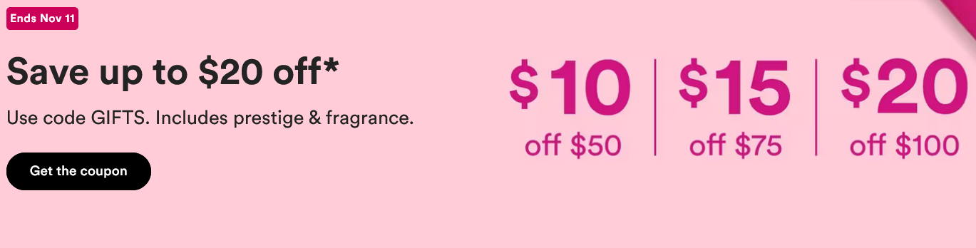 - Ulta get $10 off $50 purchase; $15 off $75 purchase or $20 off $100 purchase including prestige beauty and fragrance use promo code GIFT.
