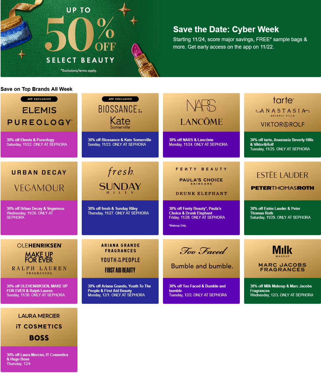Sephora Black Friday 2025 preview is now live: sephora.com/beauty/cyber-week-deals-preview [here]. Save the Date: Cyber Week starting 11/22 with APP early access.
