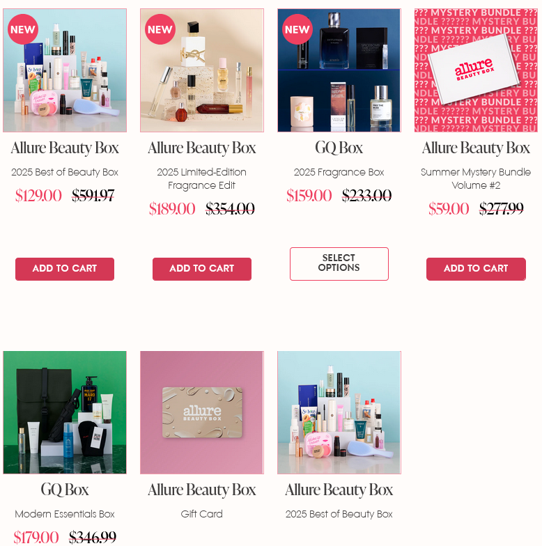 Allure (NEW) Get extra 20% off sitewide code BF20. Allure Beauty Box Limited Edition Holiday Best of Beauty Box: $129 for non-members ($591 value). Allure Beauty Box 2025 Limited-Edition Fragrance Edit is priced at $79 for members or $189 for non-members. Valued at over $350. Explore all Allure and GQ limited edition beauty boxes.