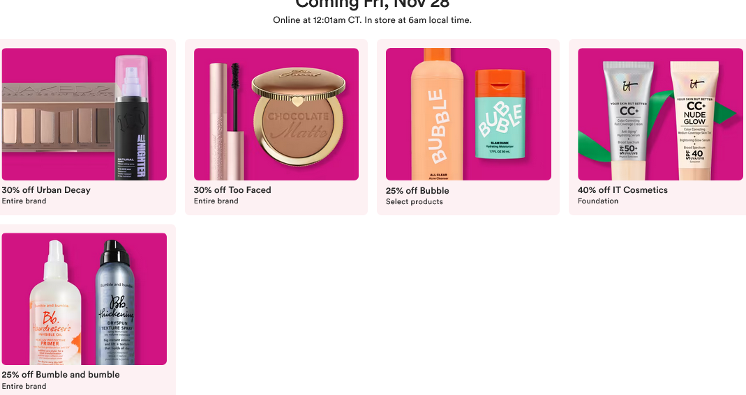 - Ulta 🔥Ulta Black Friday 2025 is here! Ulta revealed NEW Black Friday Deals for Nov 27-28 at ulta.com/promotion/black-friday. New deals include up to 50% off YSL, Estee Lauder, Bubble, Valentino, Urban Decay, Clinique and more. Free 3 Piece Tarte Gift with $70 makeup purchase.