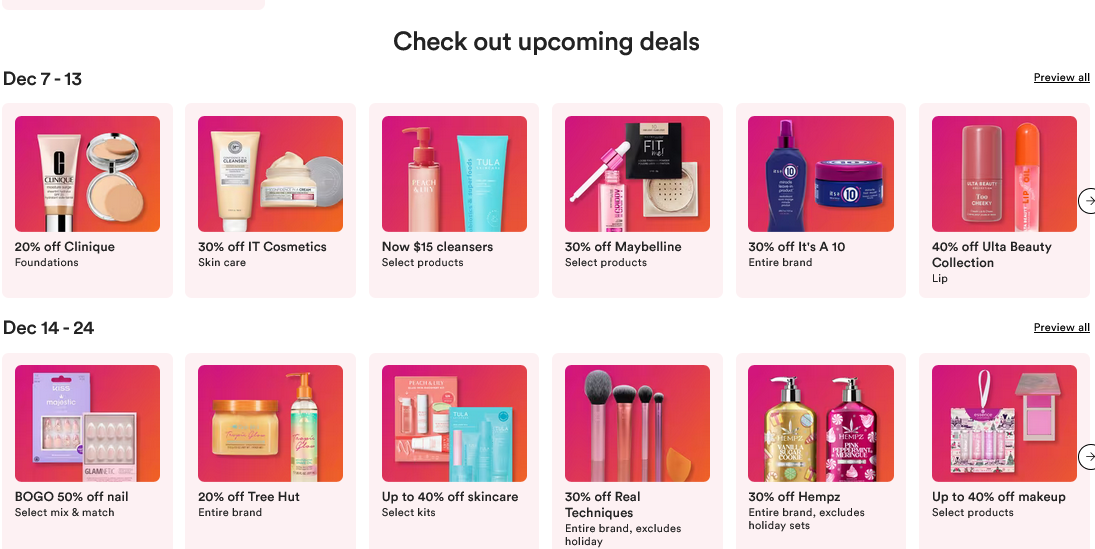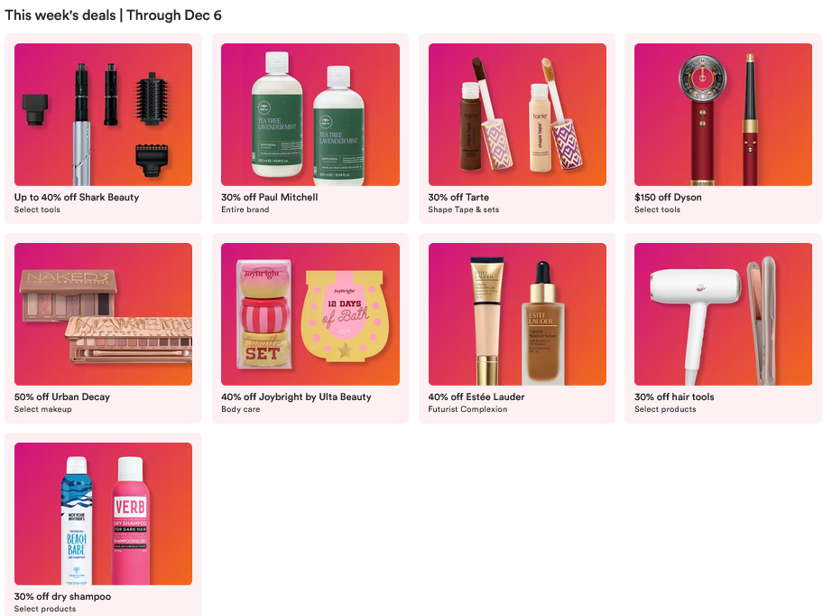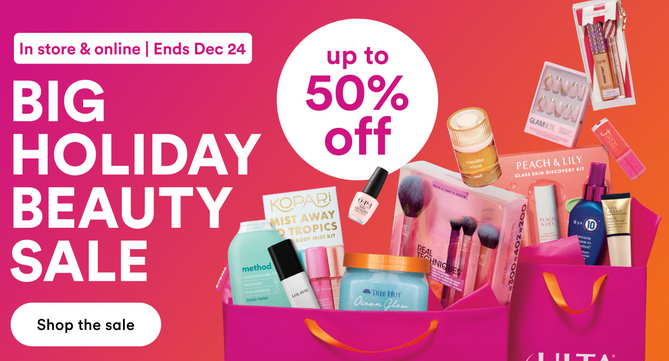 - Ulta Big Holiday Sale is here – get up to 50% off holiday gifts through Dec 24 – new deals every week. Get up to 50% off Shark Beauty Devices, DYSON devices, Estee Lauder Futuristic line, Tarte and more.