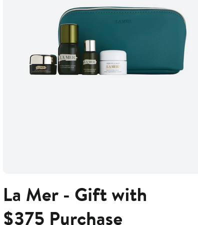 Free 8pc deluxe gift with $375 purchase: Receive deluxe samples of The Moisturizing Soft Cream (0.24 oz.), The Essence Foaming Cleanser (1 oz.), The Eye Concentrate (0.17 oz.), The Regenerating Serum (0.17 oz.), The Balancing Treatment Lotion (0.5 oz.), The Night Recovery Concentrate (0.24 oz.) and The Concentrate Serum (0.17 oz.) in a cosmetics bag with your $375 La Mer purchase. A $240 value.