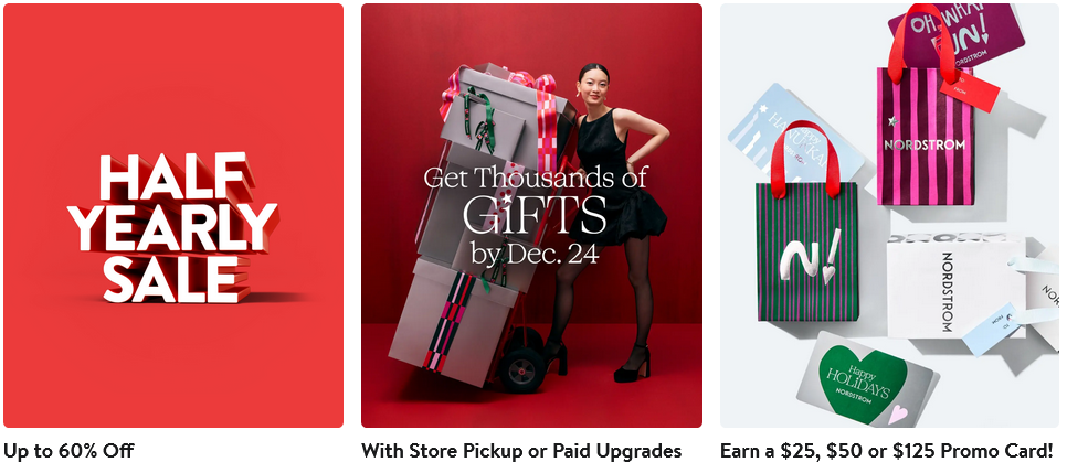 NORDSTROM‘s greatest gift cards sale is back December 20 – 25, 2025. Online offer valid for everyone. Earn a $25, $50 or $125 Promo Card when you buy $150, $250 or $500 in gift cards online. Ends Dec. 25. Promo card will be emailed around Jan. 6 and expires Feb. 6. See Restrictions.