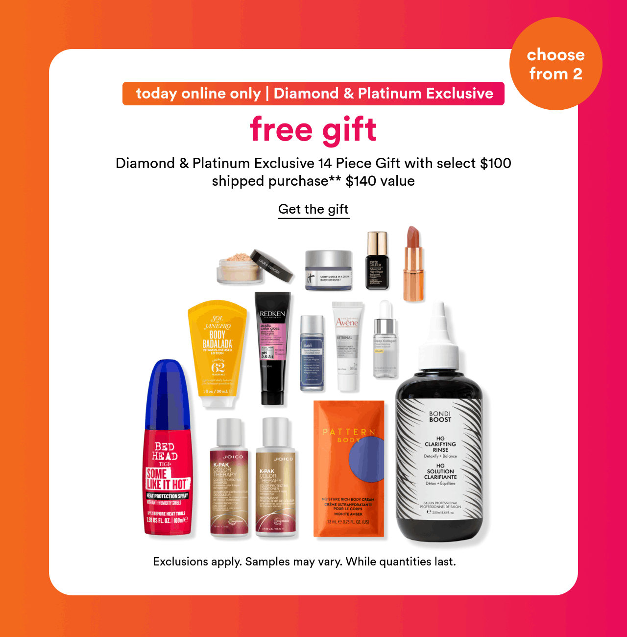 - Ulta – Free Diamond & Platinum Exclusive! Choose a free 14pc gift worth $140 (2 options) with any $100 purchase.