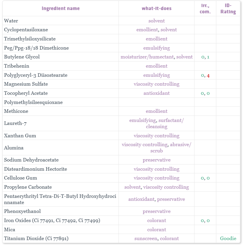 Water\Aqua\Eau, Cyclopentasiloxane, Trimethylsiloxysilicate, Peg/Ppg-18/18 Dimethicone, Butylene Glycol, Tribehenin, Polyglyceryl-3 Diisostearate, Magnesium Sulfate, Tocopheryl Acetate, Polymethylsilsesquioxane, Methicone, Laureth-7, Xanthan Gum, Alumina, Sodium Dehydroacetate, Disteardimonium Hectorite, Cellulose Gum, Propylene Carbonate, Pentaerythrityl Tetra-Di-T-Butyl Hydroxyhydrocinnamate, Phenoxyethanol, [+/- Iron Oxides (Ci 77491, Ci 77492, Ci 77499), Mica, Titanium Dioxide (Ci 77891)].
