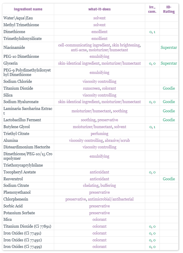 Water\Aqua\Eau, Methyl Trimethicone, Dimethicone, Trimethylsiloxysilicate, Niacinamide, PEG-10 Dimethicone, Glycerin, PEG-9 Polydimethylsiloxyethyl Dimethicone, Sodium Chloride, Titanium Dioxide, Silica, Sodium Hyaluronate, Laminaria Saccharina Extract, Lactobacillus Ferment, Butylene Glycol, Triethyl Citrate, Alumina, Disteardimonium Hectorite, Dimethicone/Peg-10/15 Crosspolymer, Triethoxycaprylylsilane, Tocopheryl Acetate, Resveratrol, Sodium Citrate, Phenoxyethanol, Chlorphenesin, Sorbic Acid, Potassium Sorbate. May Contain: Mica, Titanium Dioxide (CI 77891), Iron Oxides (CI 77491), Iron Oxides (CI 77492), Iron Oxides (CI 77499).