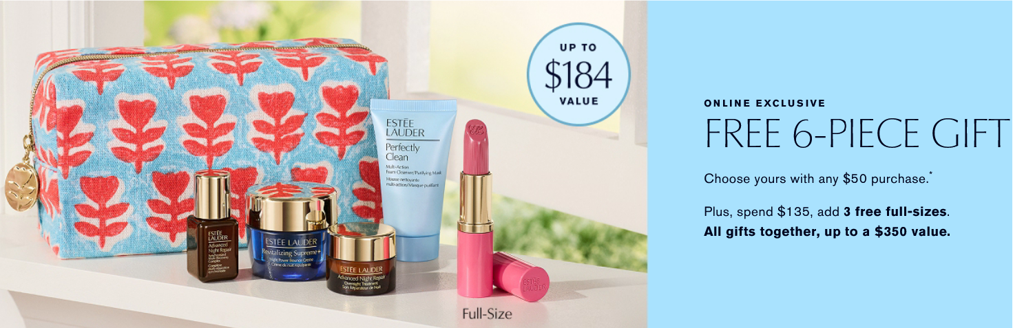 Estee Lauder (NEW) Choose a free 6-piece gift with any $50 purchase. Plus, spend $135, add 3 free full-sizes. All gifts together, up to a $350 value.